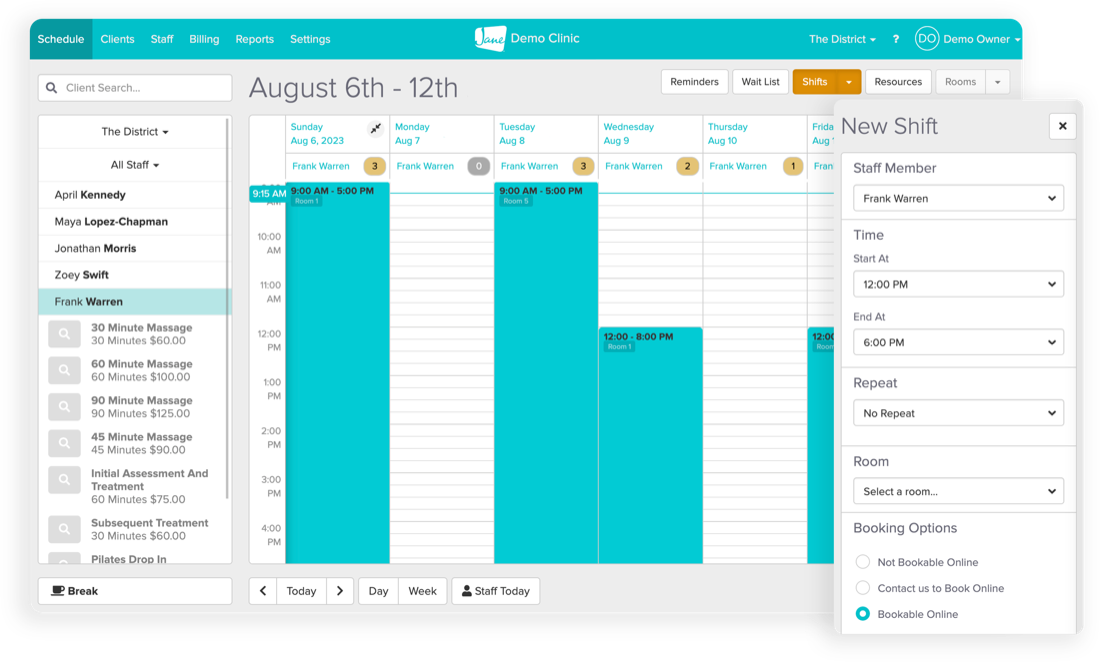 More staff and more locations won’t mean growing pains with Jane. Quite the opposite, in fact! You can easily add additional staff members and locations to Jane and manage everything from one view.